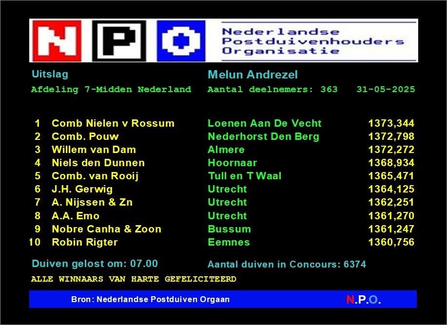 7.6.2014 Salbris 580 km. 1e van 1.145 duiven NPO(N&Z) 2e van 6.598 duiven